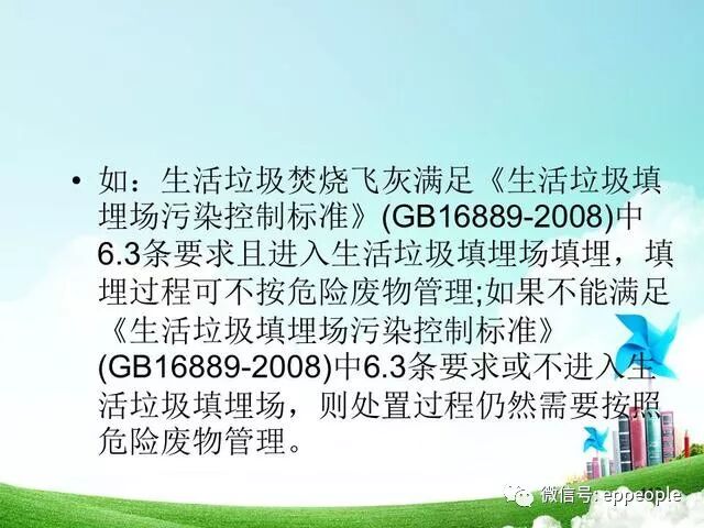 如:生活垃圾焚烧飞灰满足《生活垃圾填埋场污染控制标准》(GB16889-2008)中6.3条要求且进入生活垃圾填埋场填埋,填埋过程可不按危险废物管理;如果不能满足《生活垃圾填埋场污染控制标准》(GB16889-2008)中6.3条要求或不进入生活垃圾填埋场,则处置过程仍然需要按照危险废物管理。